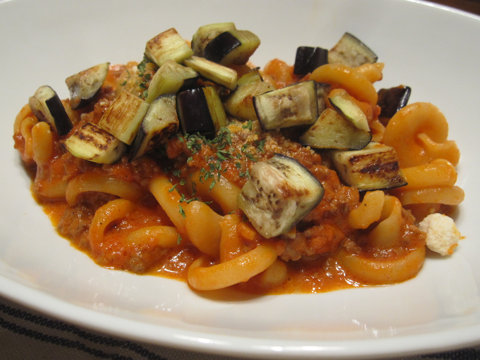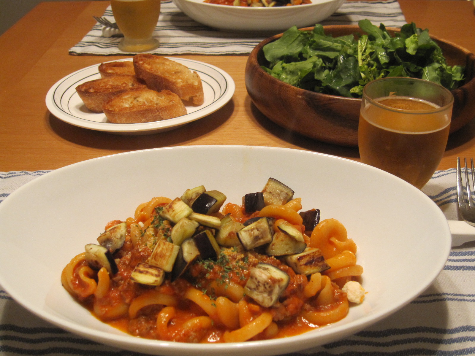 冷凍庫で挽肉を発掘、野菜室で茄子も発掘してミートソースに。