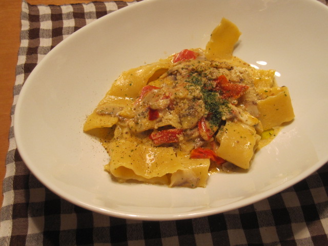 平打ち麺の『パッパルデッレ』はマッシュルームたっぷりのトマトクリームソースで。