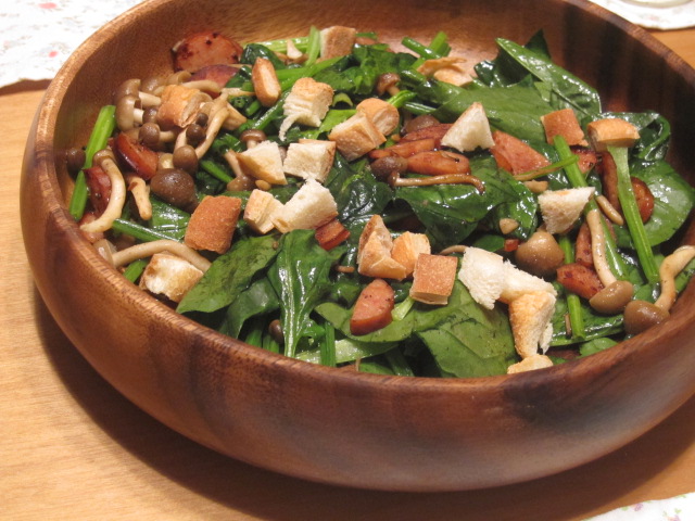 ほうれん草+ソーセージ+しめじのホットサラダ。