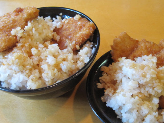 ごはん→カツ3枚→ごはん→カツ3枚、って言うデラックスなかつ丼。