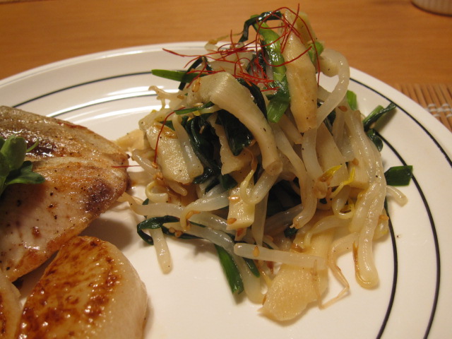 ナムルはもやしとニラと若竹を胡麻油で和えたものです。