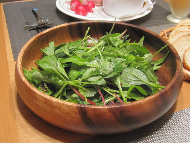 ミックスリーフのサラダにはラディッシュの葉も入れちゃいました。