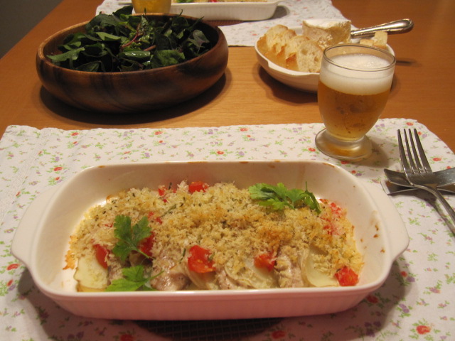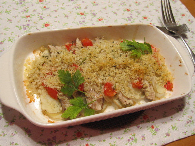 鰯とスライスした新じゃがにハーブを混ぜたパン粉をたっぷりかけて