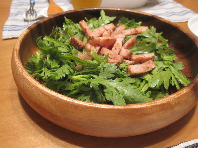 春菊に炒めたベーコンをのっけたサラダ。