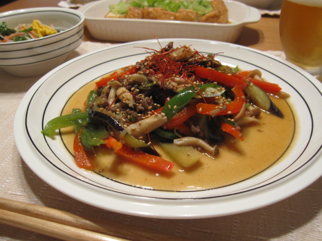 茄子・ピーマン・赤パプリカ・しめじの味噌炒め。