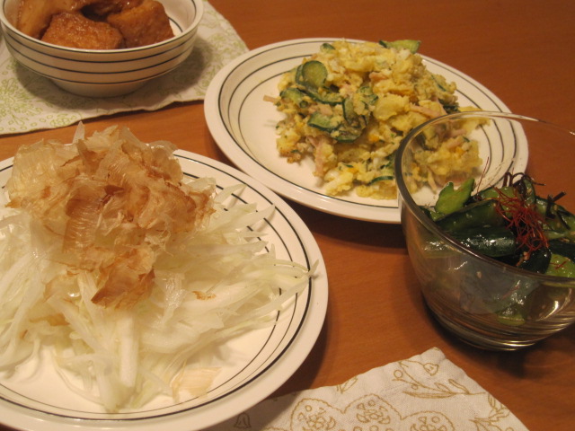 オニオンスライスとポテトサラダ。そして胡瓜のタタキ。
