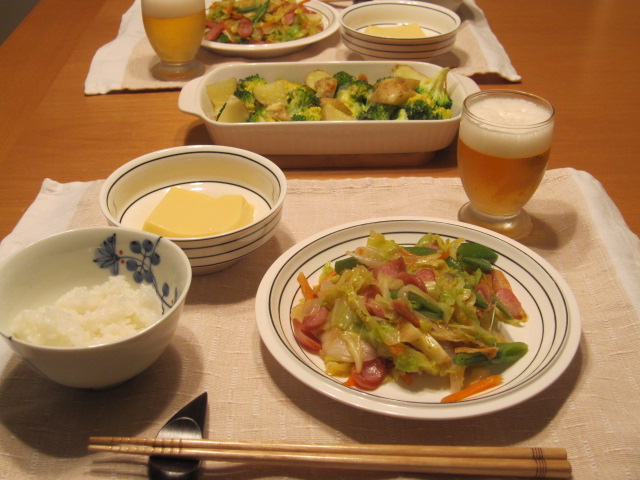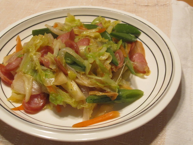 肉も魚もなく、ソーセージで野菜炒め、味付けはダシダ。