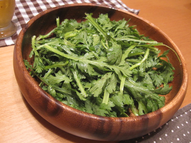ピリカラ蒟蒻・梅干し・枝豆・春菊と生ハムのサラダ、でした。