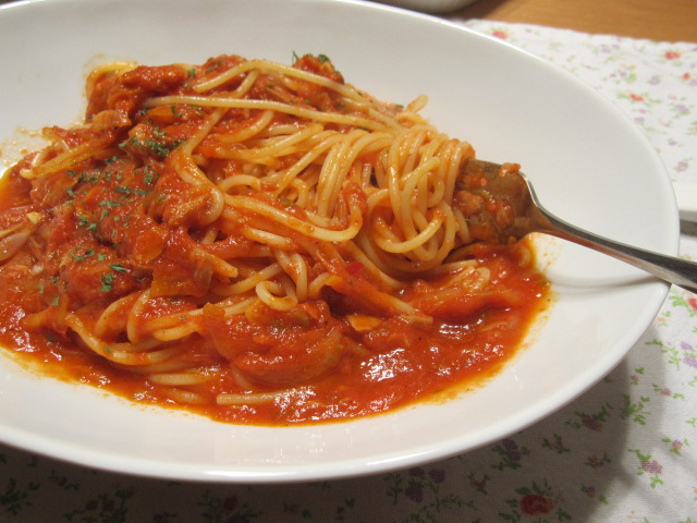 トマト缶とツナ缶、玉葱とケッパー入りのパスタ。