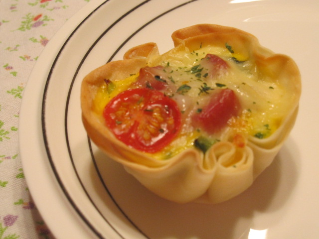 2.①にほうれん草・ベーコンを入れ、◎を流し入れ、チーズとトマトをのせる。