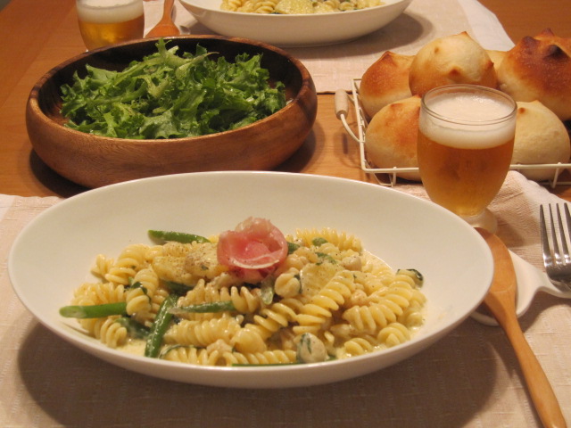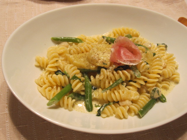 たっぷりのホタテ貝柱とじゃがいもとインゲンのクリームパスタ。