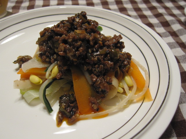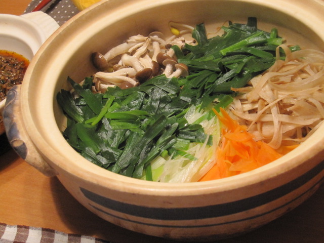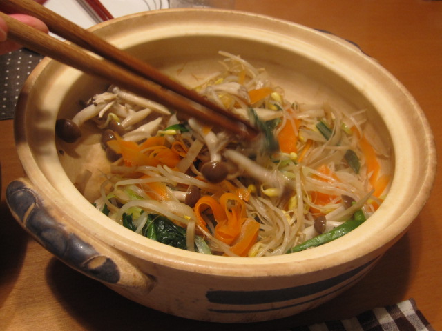 野菜はもやし・牛蒡・人参・ニラ・シメジ・葱にダシダをふりかけて、