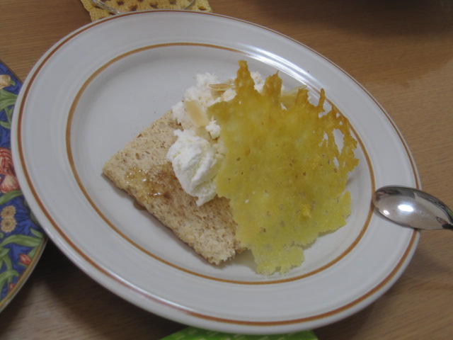 クラッカーにのったカッテージチーズは焼いたチーズ付。