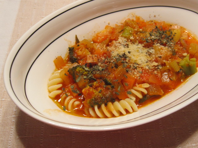 パスタも少しだけ茹でて、ミネストローネをぶっかけました。