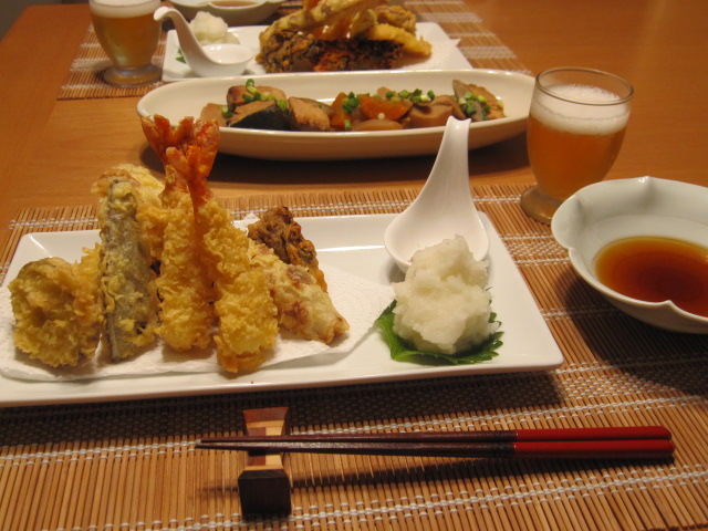 エビ・イカ・ちくわ・茄子・舞茸・さつまいも・かき揚げ。