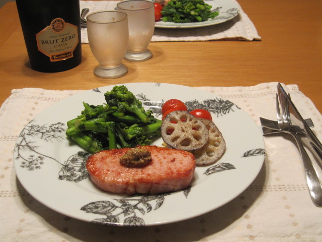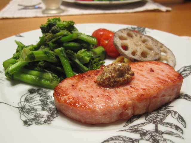 高級ハム3種の内、プレーンなタイプを厚切りにしてソテーしました。