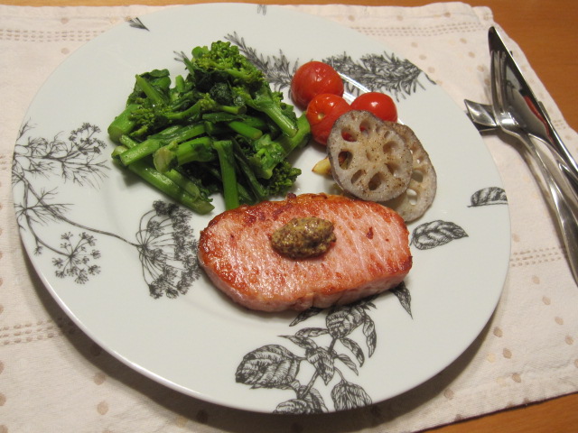 付け合わせは菜の花のソテーと蓮根とトマト。