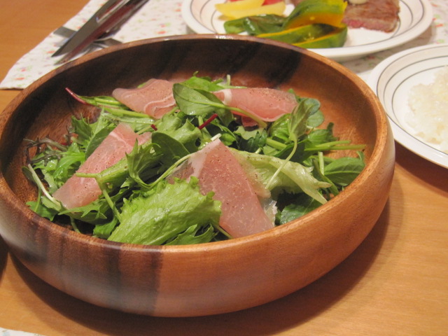 サラダはミックスリーフと冷蔵庫で発掘した生ハム。