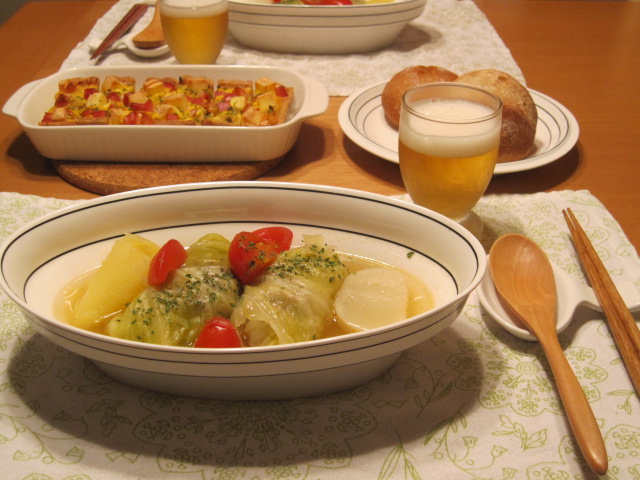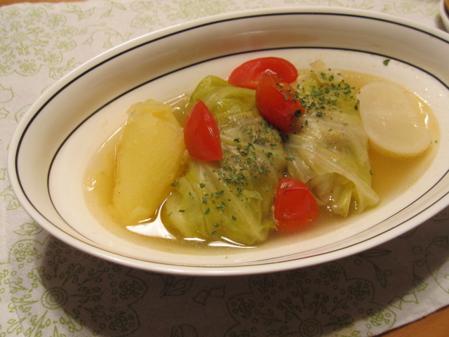 キャベツと豚バラスライスを重ねてくるくるしたロールキャベツ。