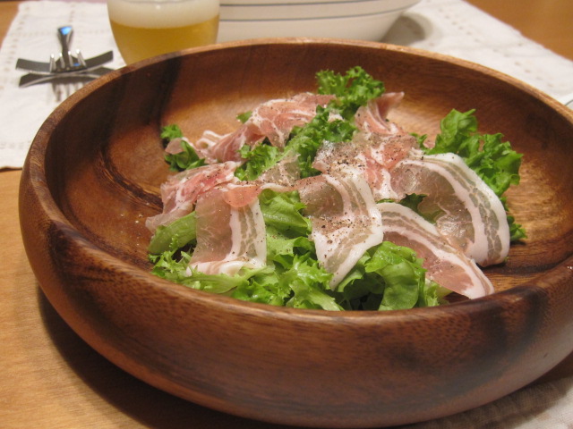 少しだけ残っていた葉っぱと少量のパンチェッタでサラダ。
