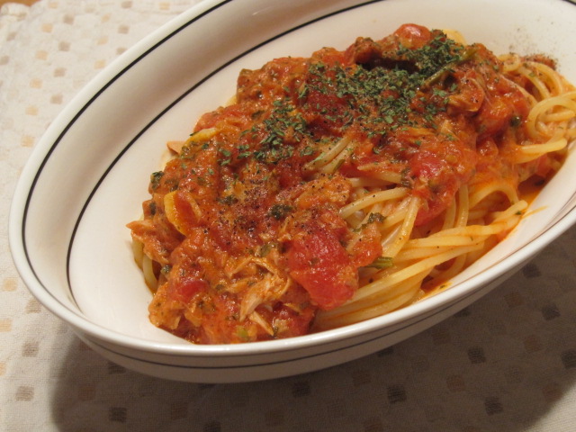 常備しているツナ缶でトマトパスタ。