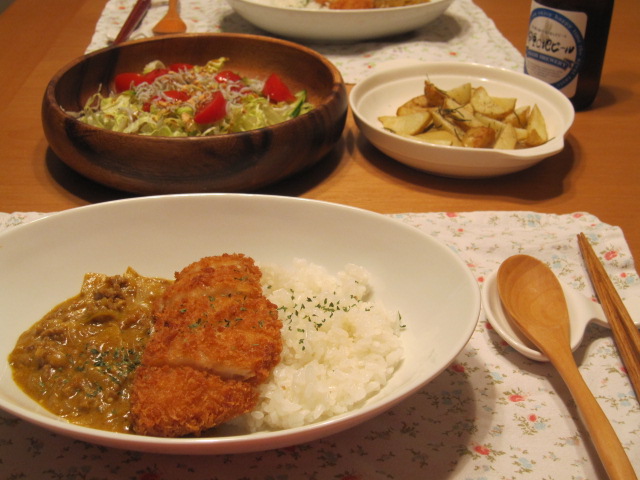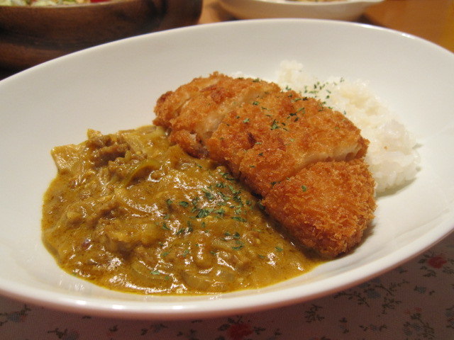 挽肉・玉葱・蓮根だけのカレーにお安かったチキンカツをON。