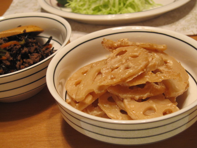 蓮根はポン酢で炒めてからマヨネーズと金胡麻タレ(冷蔵庫で発掘)、