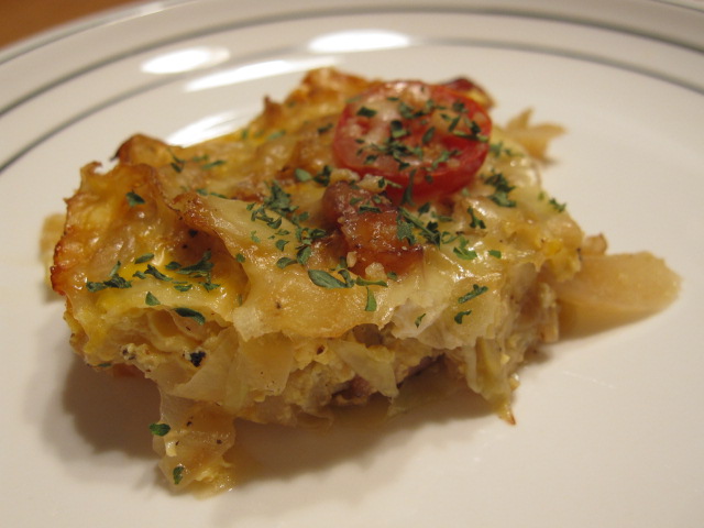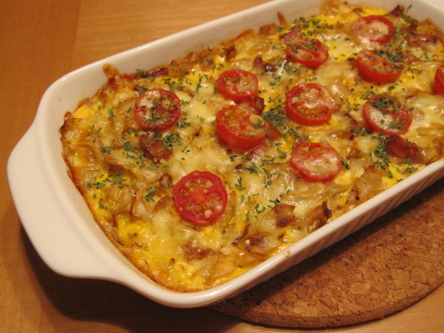 キャベツとベーコン、たっぷりチーズとトマトをのせて
