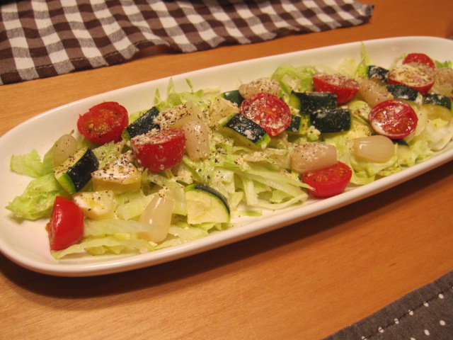 サラダはレタス・トマト・ズッキーニ・じゃがいも・らっきょう。