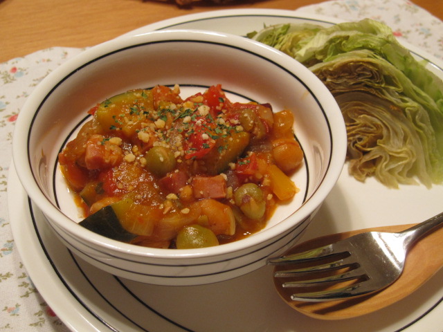 野菜の切れ端やらミックスビーンズ缶でチリコンカン作成。