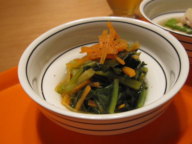 レンチンしたほうれん草と人参はうまたれでおひたし。
