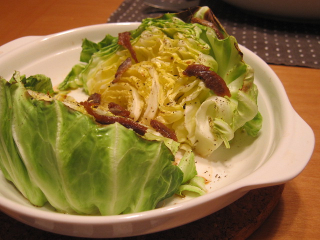 キャベツは切ってアンチョビのせてオリーブ油かけて