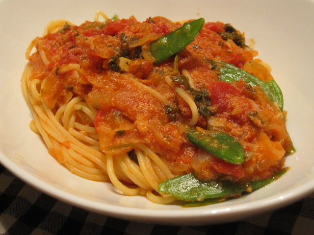 彩りの絹サヤの他に、転々と黒く見えるのは生パセリ。