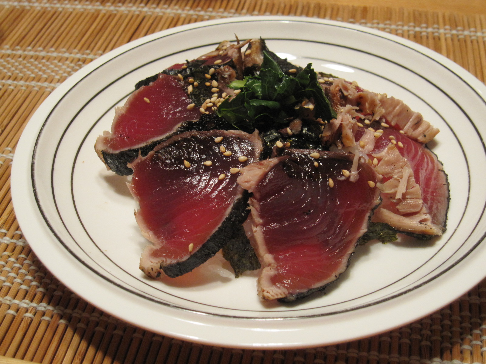 ごはんに白胡麻と刻みガリを混ぜて、鰹乗っけてます。