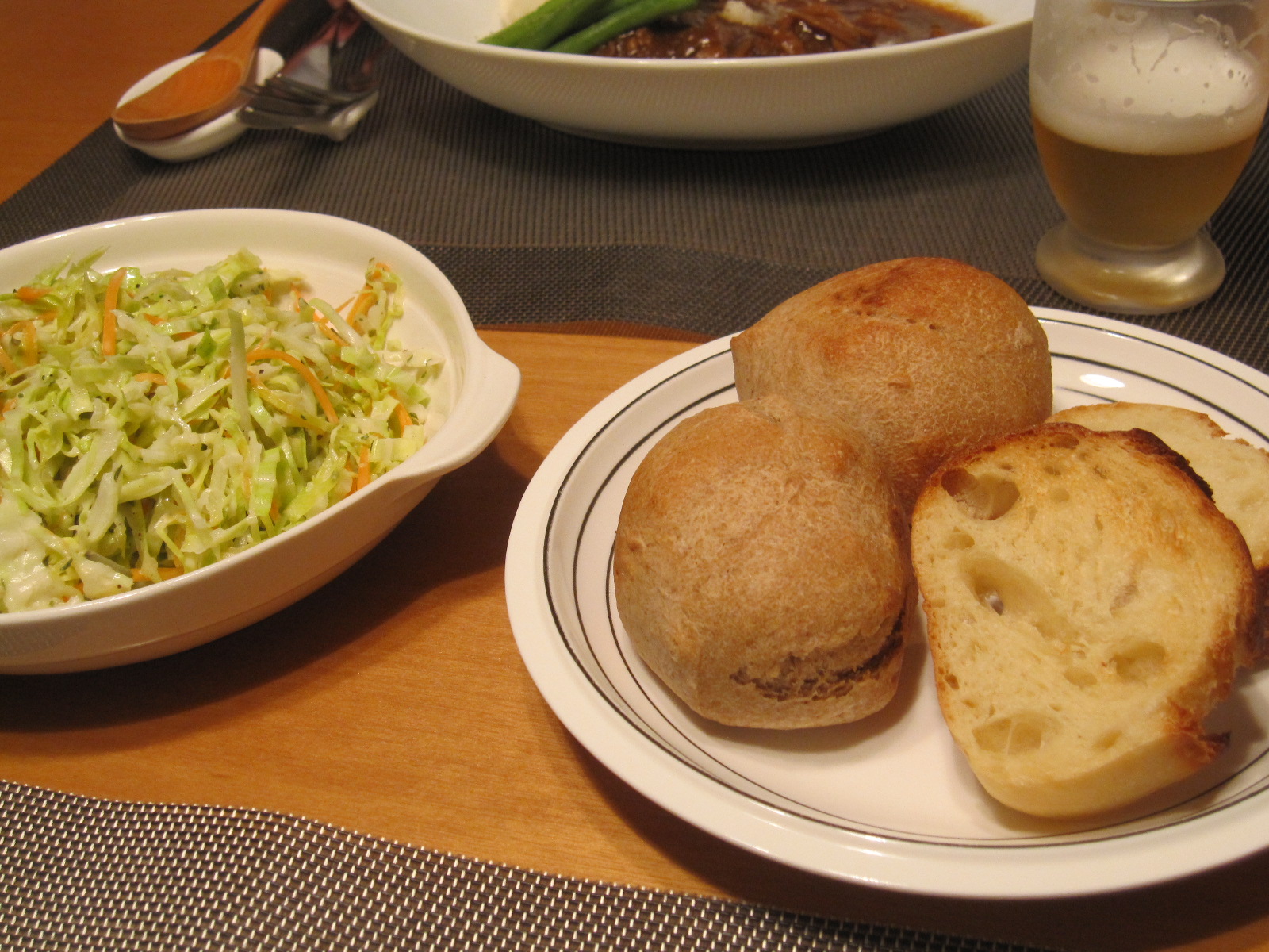 サイドにコールスローと冷凍庫から発掘したパン。