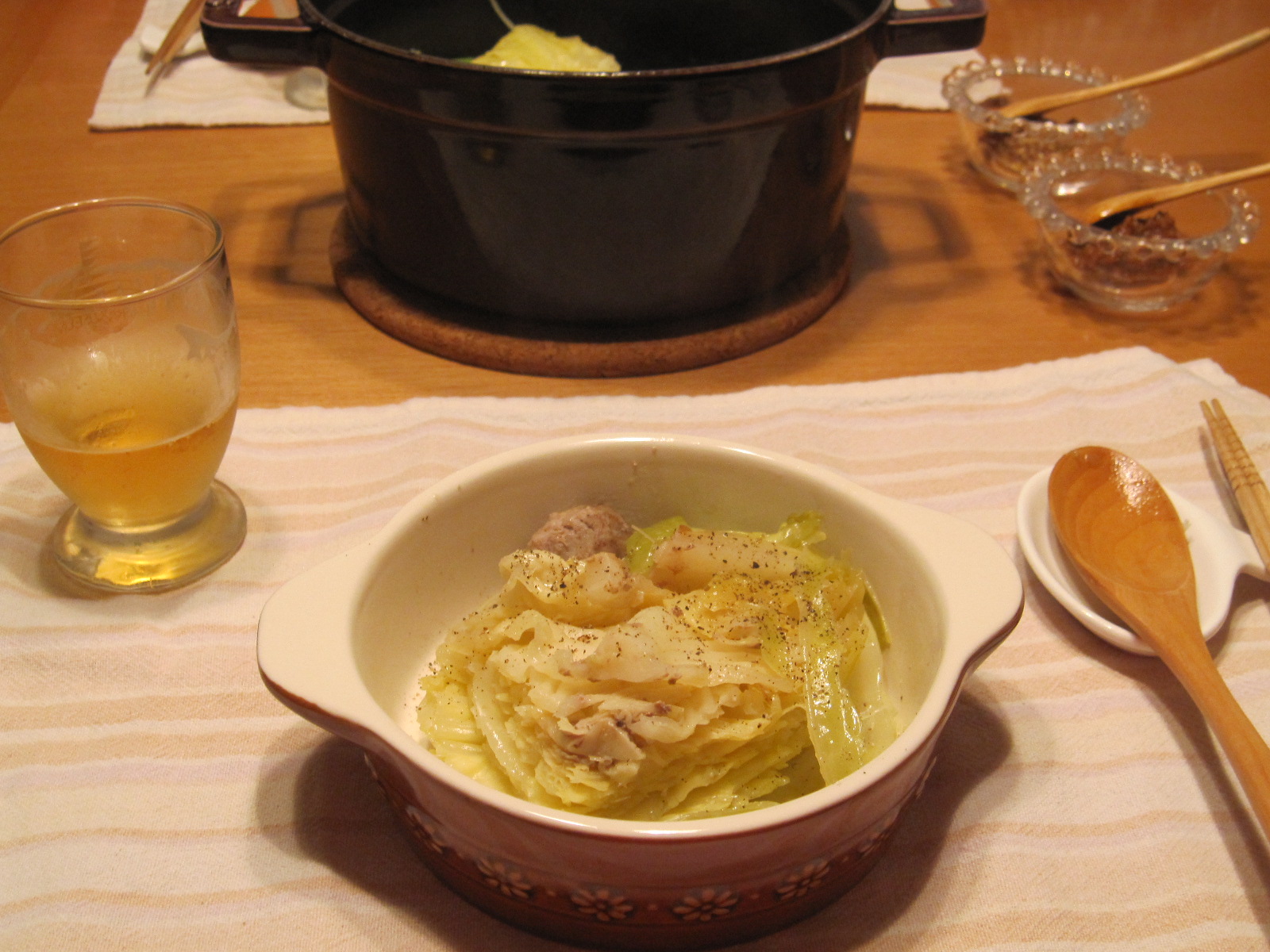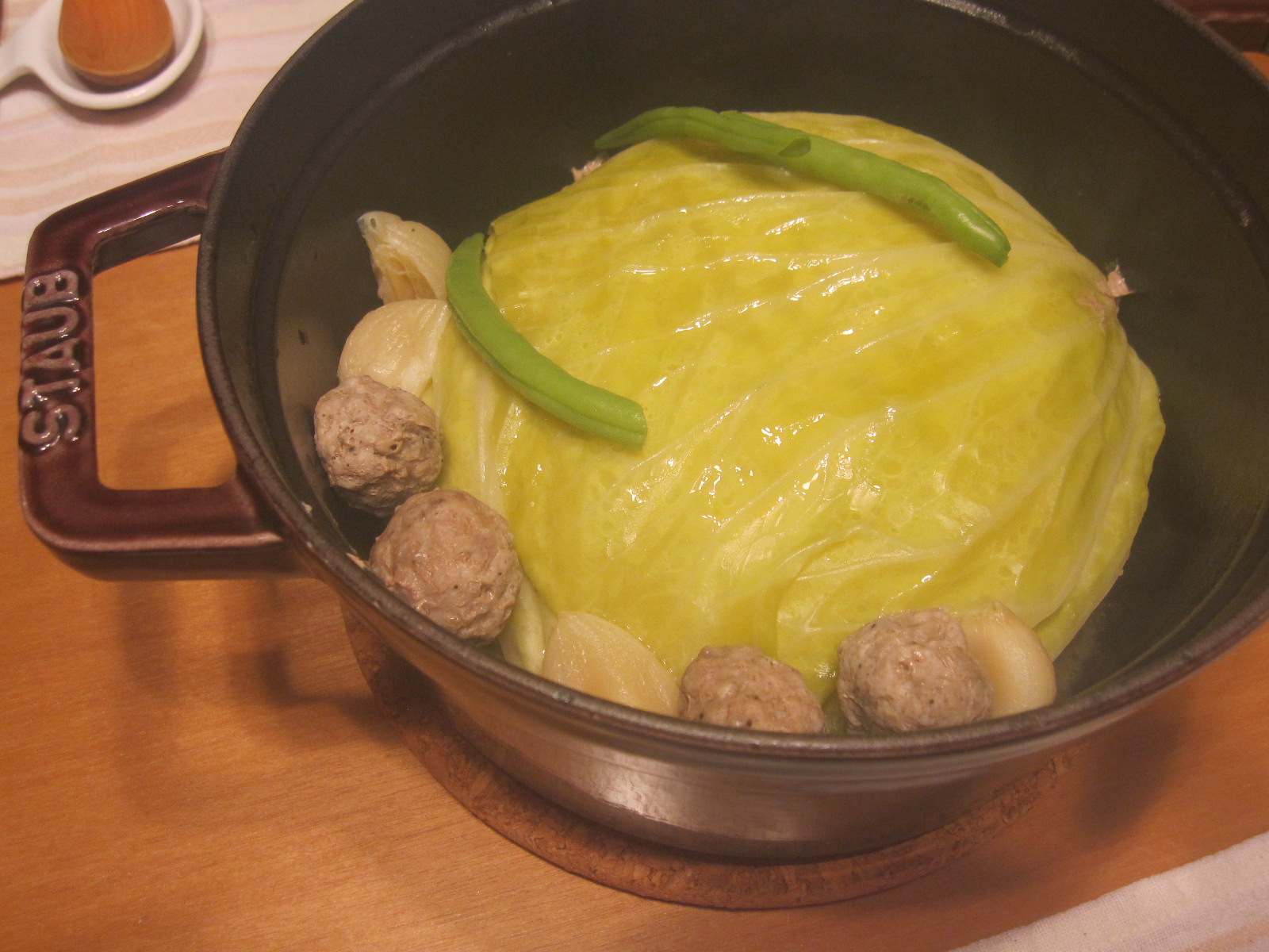 キャベツの芯を抜いて挽肉をつめて、ストウブで蒸し煮。