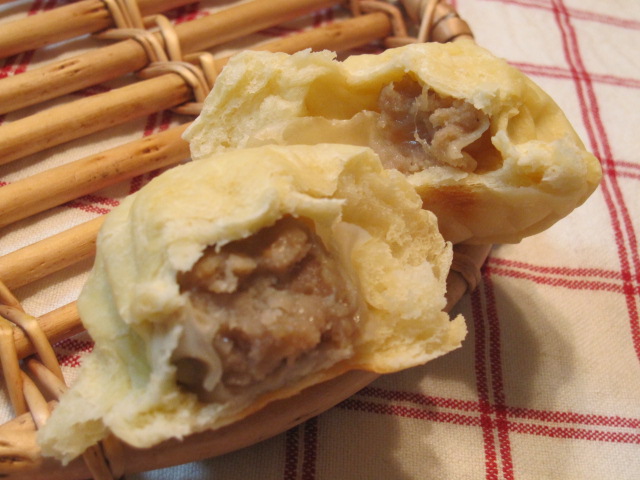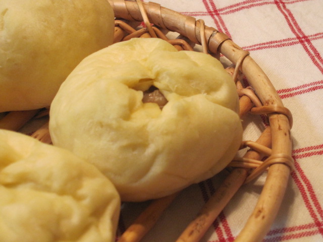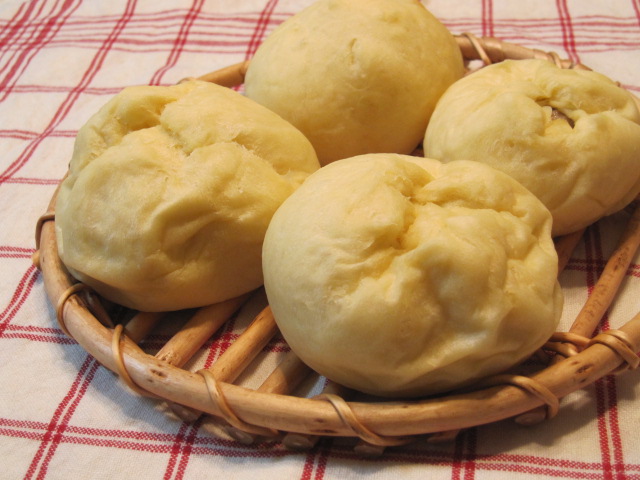 白い塊焼売パン、辛子醤油を付けて食べます。