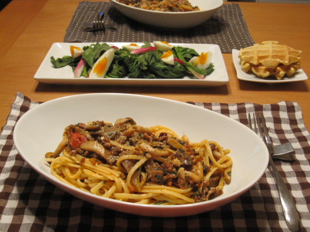 パンの在庫はなく、いつぞやのそば粉のワッフルをパン代わりに。