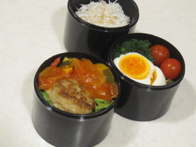 ラタトゥイユと一緒に詰めて煮込みハンバーグ風。
