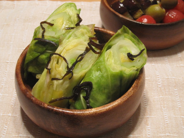 レンチンしたキャベツをくるくるして、うまたれと塩昆布で漬けただけ。