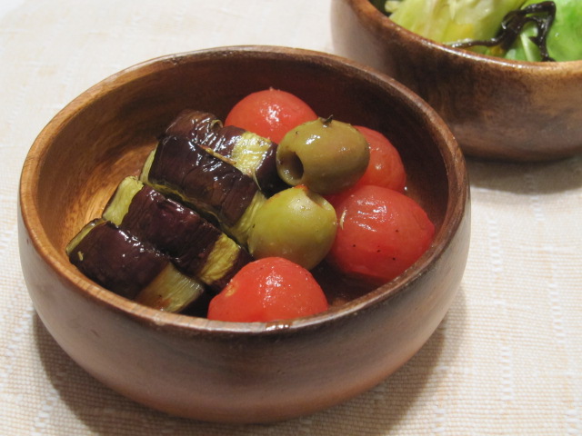 トースターで焼いた茄子と湯剥きしたトマトとオリーブのマリネ。