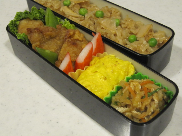 から揚げの残りと筍ごはんの残り。食材のへそくり万歳。