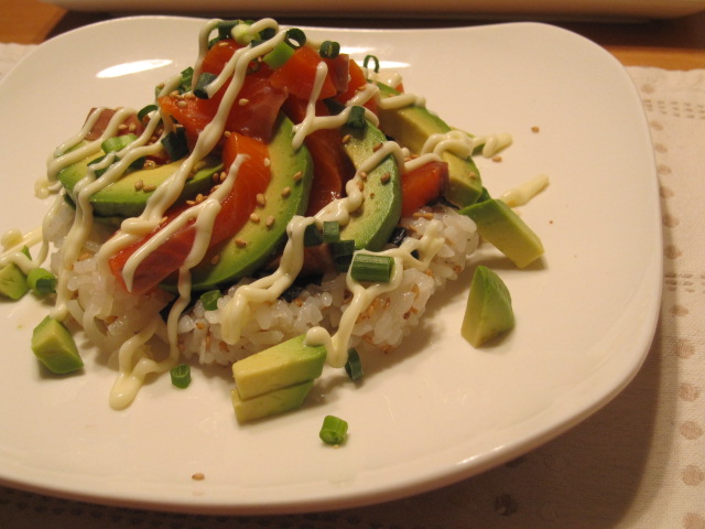 サーモンとアボカドをのせて、マヨとわさび醤油で食べます。