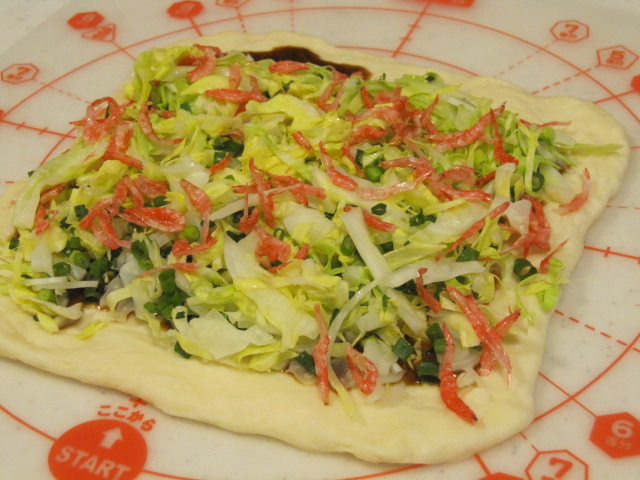 ソース塗って(塗り過ぎて・・・)野菜置いて桜エビのせて、巻いてカット。