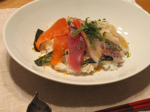 お刺身7点盛りを買って、ごはんを炊いて海鮮丼。