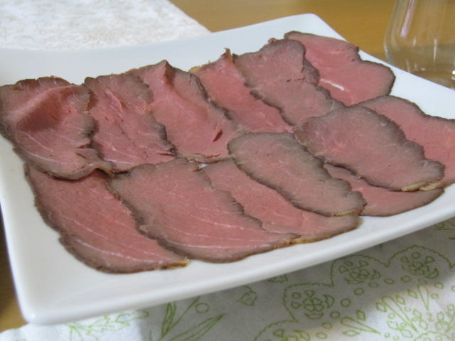 ローストビーフ(市販品)に葉っぱを巻いたりして食べます。