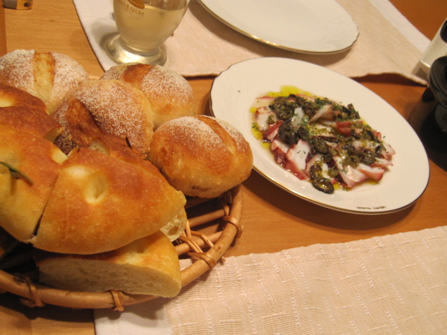 蛸のカルパッチョ・プチフランスとフォカッチャ。