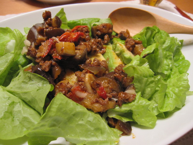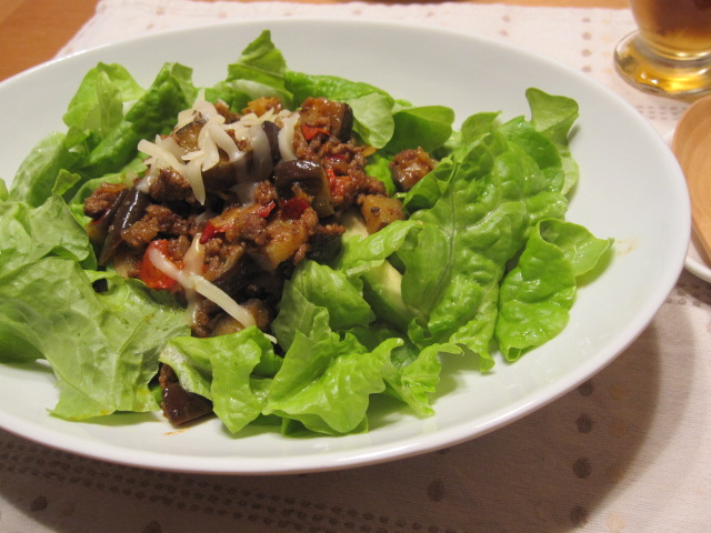 長茄子・トマト・挽肉をシーズニングミックスで炒めて、