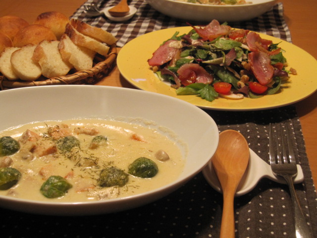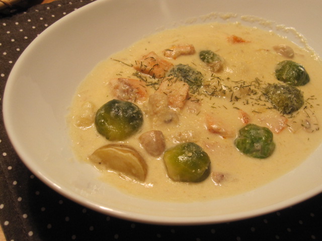 100円でゲットした芽キャベツと角切りサーモンのシチュー。