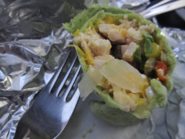 ブリトーみたいな・・・緑色の生地に包まれたチキン(またチキン!)と野菜。